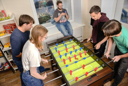 Our office has fun zones with table tennis, foosball, a PlayStation, and VR headset.